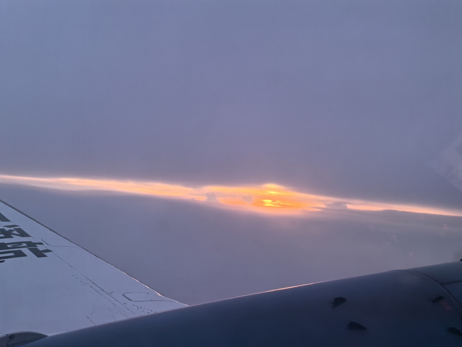 9月23日傍晚,在飞机上看到的台风外围云墙和落日
