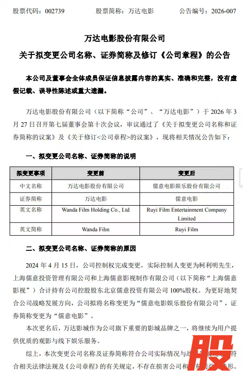 公告透露,更名是为了更好地契合公司战略转型方向,万达影城作为儒意电影旗下重要的影城品牌之一,将继续为用户提供优质的观影与线下娱乐服务。